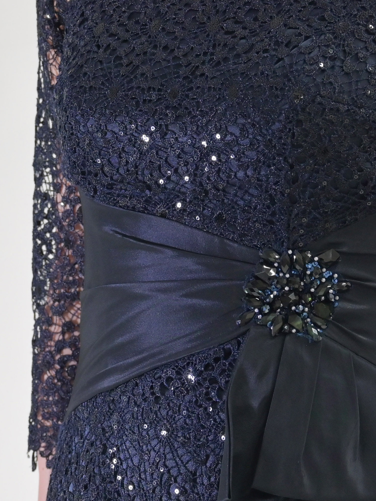 細かく特殊加工されたケミカルレースのドレスです。しなやかでありながら、型崩れしない強さも併せ持つレース生地は、ボディラインに優しく沿いつつも張り感は失わず、スタイルをよく見せる効果があります。お腹周りやヒップも目立たず、全体的に縦長のシルエットで、体形をうまくカバーしてくれる秀逸なデザインです。 レースには小さなスパンコールが全身に散りばめられていて、ドレス全体に程よい輝きを与えています。ウエスト部分には異素材のタフタ生地で、帯状の切り替えが斜めに入っています。この切り替えがさらにウエストをほっそりと見せてくれるのです。脇にはアクセントとして勲章型のビジューとリボンがついており、ドレスに華やかさをプラスしています。 襟元はやや横にひらいたボートネック。丸首よりもオシャレで、首を細く長く見せる効果もあります。袖は肘より長い7分袖。肩から腕にかけてはレースが透けて肌が見えるようなデザインですが、とても細かいレースなので透け感は気にならないほうでしょう。タイトなデザインのため、歩きやすいよう後ろにスリットが入っています。
