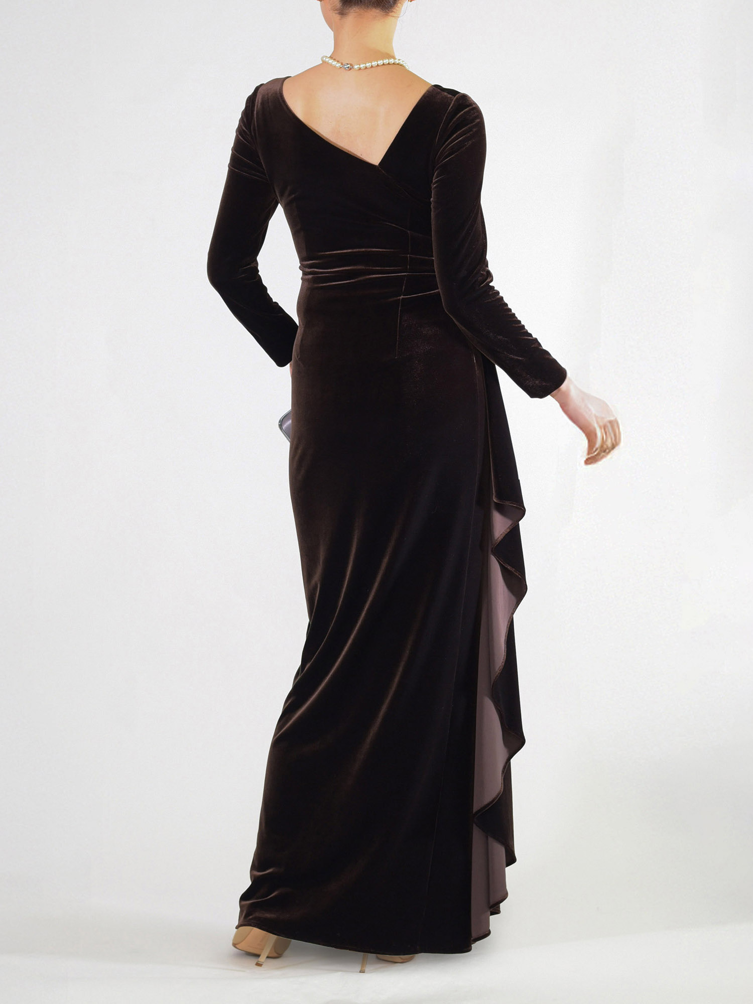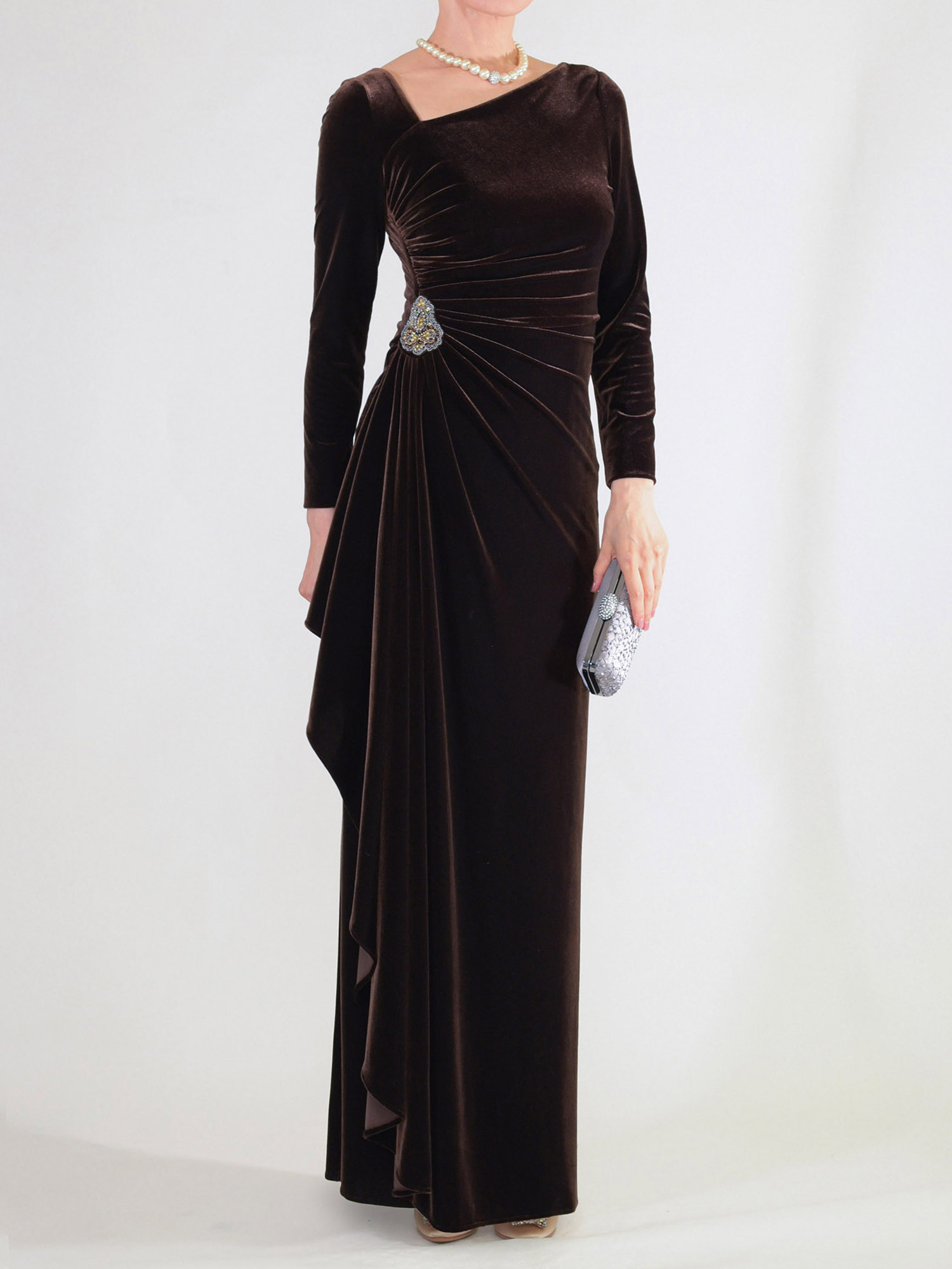 光沢と厚みのある高級なベルベット生地を使用したシンプルなドレスです。ネックラインは左右アシンメトリーになっていて、首元がすっきりと見えるカットです。シルエットはボディラインに沿っていますが、ウエスト周りはななめに寄せたドレープがお腹周りをカバー、脇には上品なビジューが控えめについています。。ボトムは巻きスカート風になっていて、ベルベット特有のツヤのありドレープがウエストから裾にかけて波打ち、、下半身のラインを美しく見せてくれます。 袖は長めで、手首のところに生地が少したまるようなデザイン。袖口がしぼってあるので、袖が長くても手首のところで留まるようにできています。生地が厚手で重さがあり、スカート部分の落ち感もとてもきれい。無駄なしわなどがよりにくいのが特徴です。さらにストレッチの効いた素材ですから動きを制限されず、着ていて楽なのも嬉しいポイント。露出も控えめで、目上の方からも支持を得られるドレスですから、安心してきていただけます。