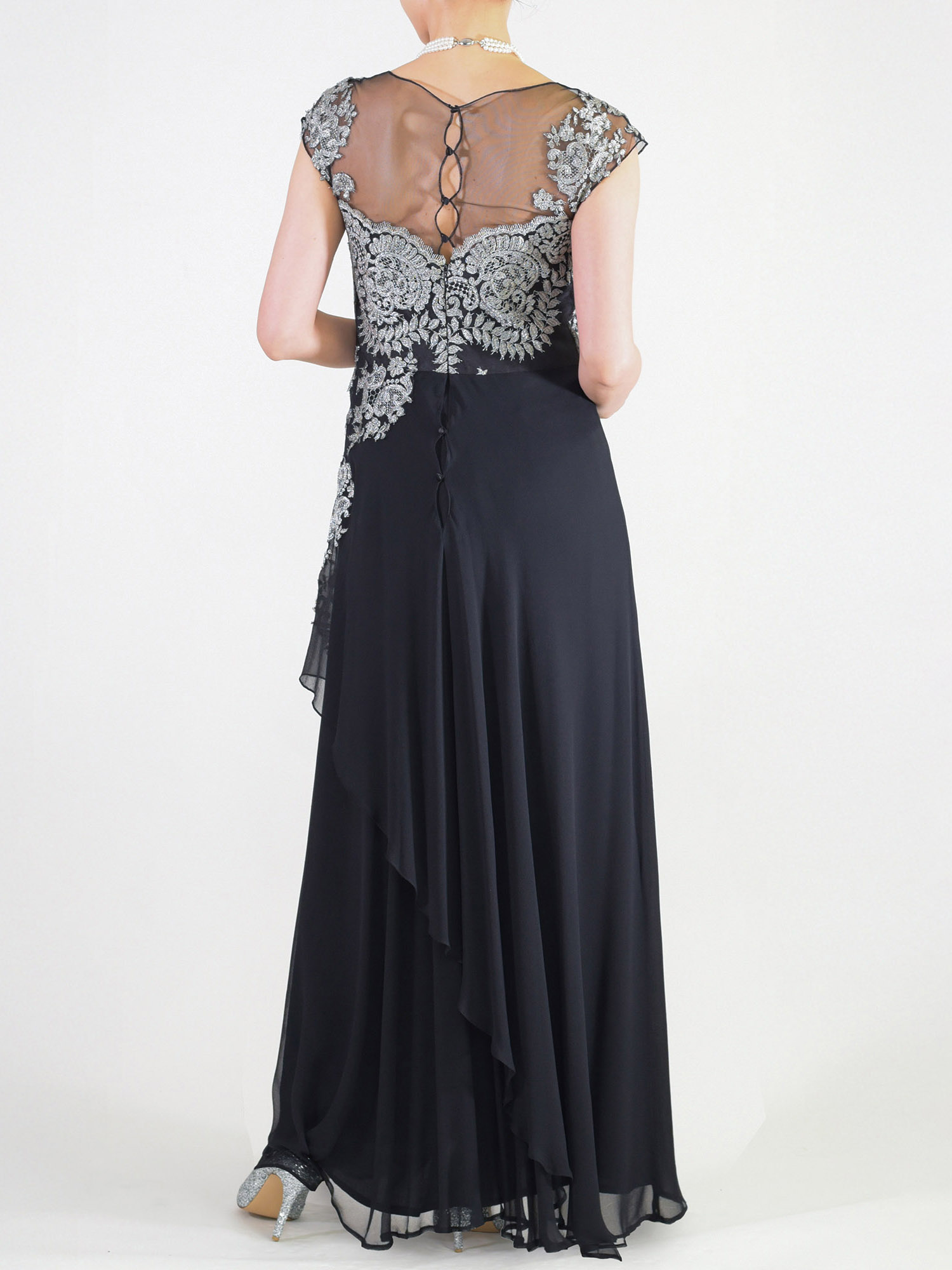 ブラックのシルクシフォンにシルバーの刺繍がほどこされた、シックでモダンなドレスです。シルバーの刺繍部分の模様はとても細かく繊細で、それがシルクシフォンの生地に手縫いで付けられていて、とても手の込んだ仕立てとなっています。襟元は細かいメッシュのレース地で、襟は丸首ではなく横に長いボートネック。このラインが首筋からデコルテを上品に見せてくれます。袖はフレンチスリーブで肩山と二の腕の上の部分がちょうど隠れるくらい。胸元から肩にかけてシルバーの刺繍がエレガンントに飾り、顔周りに明るさをプラス。そのため黒のドレスですが、暗い印象にならず、おめでたい場にもふさわしいデザインです。胸元からウエスト、身頃の左部分へと流れるアシンメトリーの刺繍は、スタイルをほっそりと見せてくれる効果があります。 スカート部分はシルクシフォンが二重になっていて、動くたびにそのシルクシフォンが軽やかに揺れるところはとてもエレガント。シルク素材なので大変軽く、着ていて負担がかからず楽に着ていただけます。