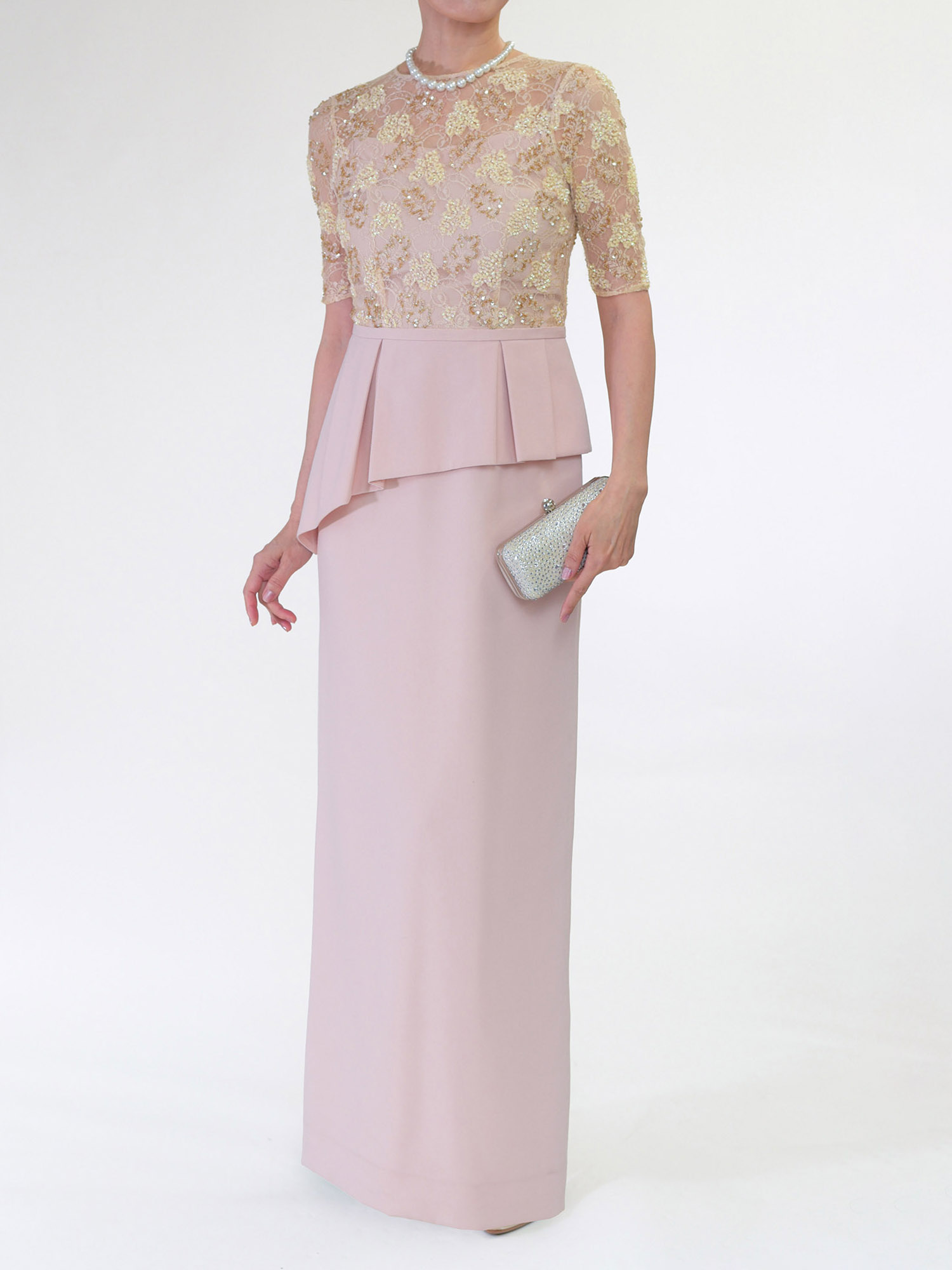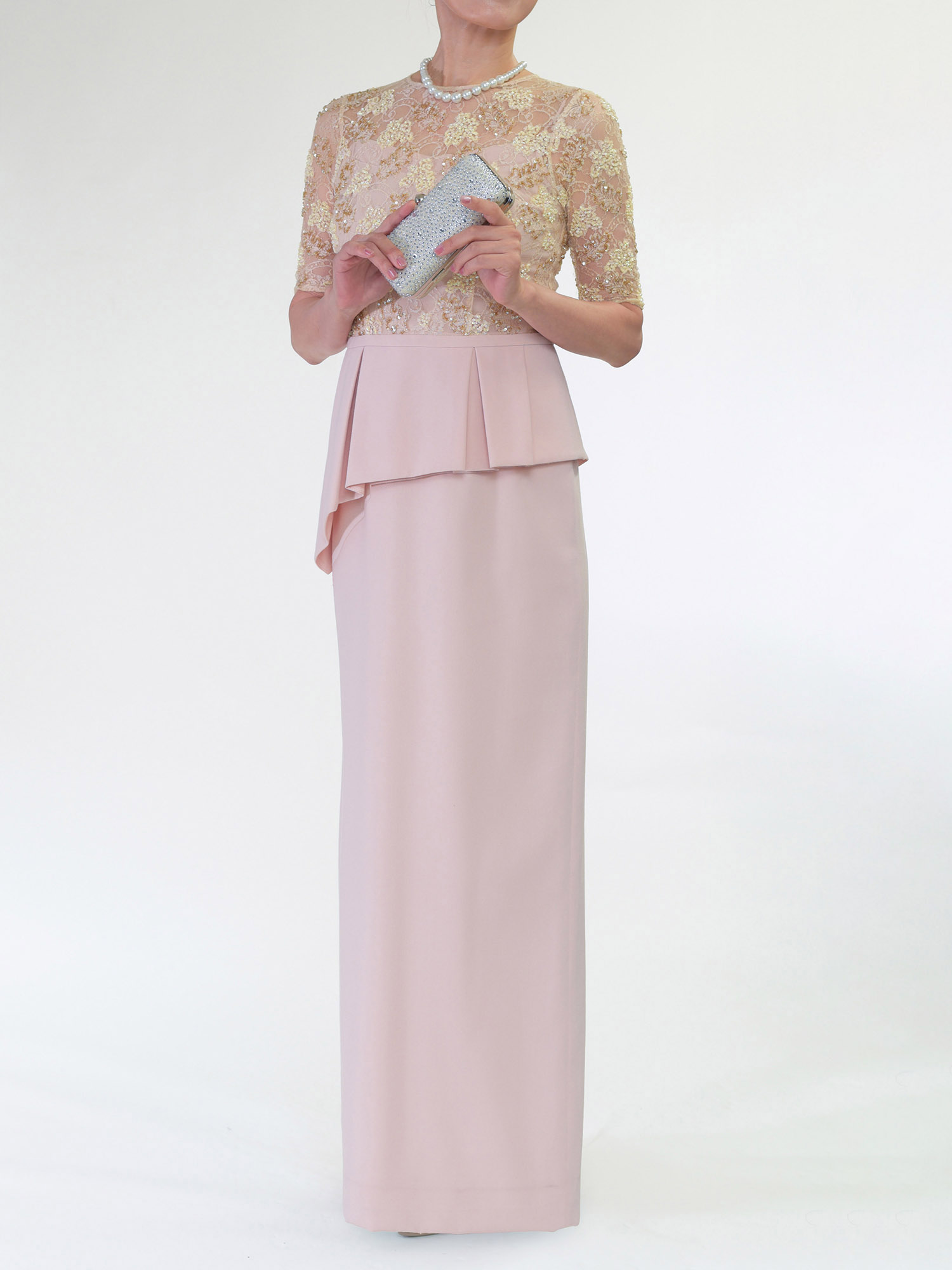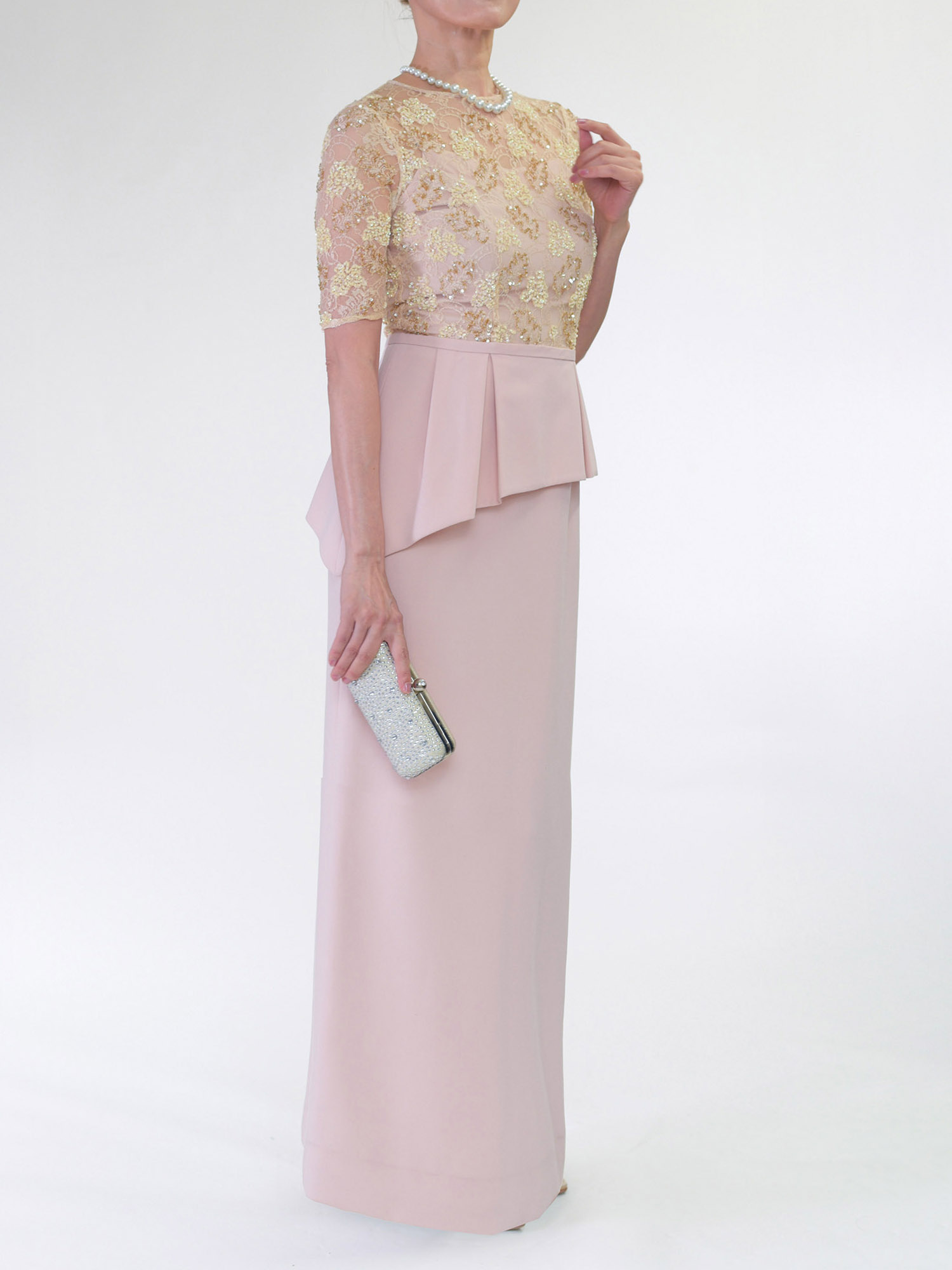 画像では白っぽく見えますが、ソフトなベビーピンクの優しいお色味です。トップはとても手の込んだシースルーレースに、細かいスパンコールが散りばめられている高級な素材。レース生地は細い糸で丁寧に編まれており、とても繊細。肌触りもソフトです。襟元はクルーネックで、胸元には肌が透けて見えないよう裏地がついているので露出しすぎないデザインに。レースの袖は肘のあたりまでくる五分袖。気になる二の腕もレースの花模様がうまく隠してくれます。 ボトムは上質で肌触りの良いジョーゼット地。程よい厚みがありますから、スカート部分の落ち感もきれい。ストレートのフォルムがとても美しく出てきます。身幅が適度にあるので、下半身のボディラインも目立ちません。ウエストにはアシンメトリーのペプラムが施されて、気になるお腹や腰周りをしっかりカバー。ストレートのラインなので、歩きにくくないよう後ろにはスリットが入っています。