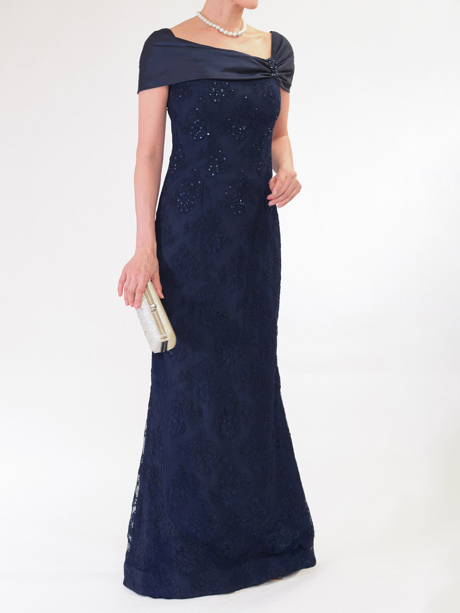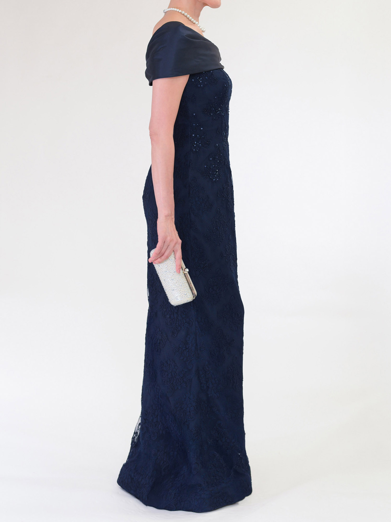 総レースのマーメイドラインのドレスです。レースの生地は高級なものを使用しており、レース地の上に繊細な刺繍が施されています。さらに上半身には華やかさを加えるためスパンコールが散りばめられていてゴージャスな仕上がりに。ウエストから下の部分にはスパンコールがついていないので、派手すぎることもなく上品で洗練されたデザインです。 全体的にはマーメイドのシルエット。上から下まで1枚の布で仕立ててあり、ウエスト部分に切り替えがありません。立体的なパターンで作られていますから、ボディが入るときれいな流線型のマーメイドラインが完成します。 首周りは張りのあるタフタ素材の襟がついていて、これが胸元に程よいボリュームを与えています。そのため顔周りも明るくふわっとした印象に。肩山から上腕部分までタフタのカラーがすっぽりと包み込むため、気になる二の腕もカバーされて袖がなくても安心して着ていただけます。