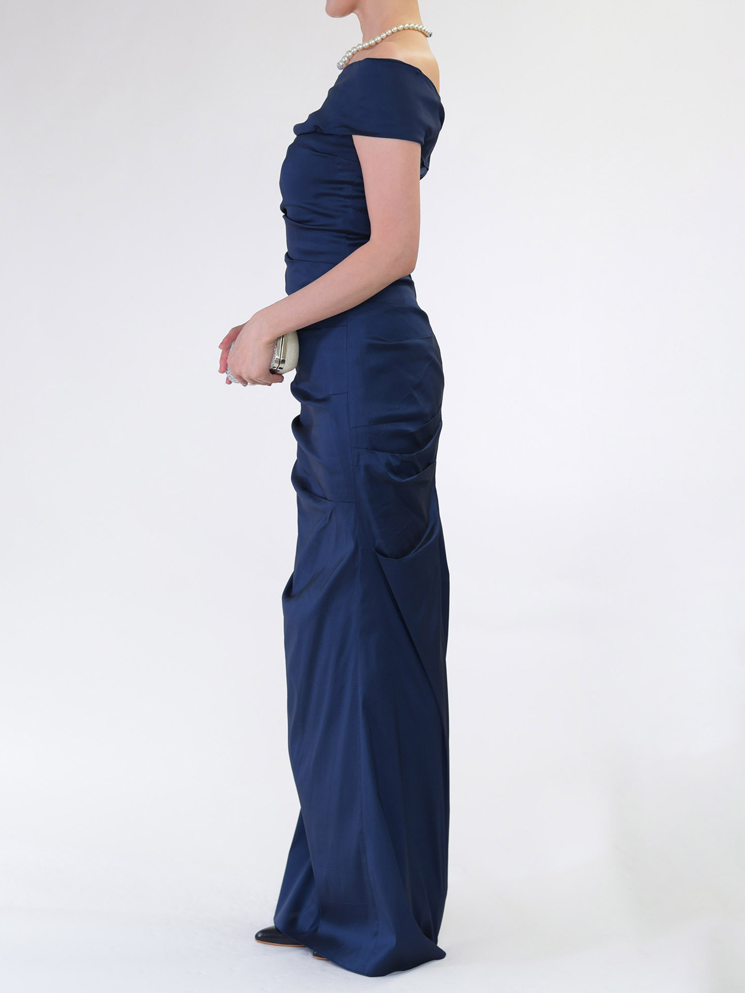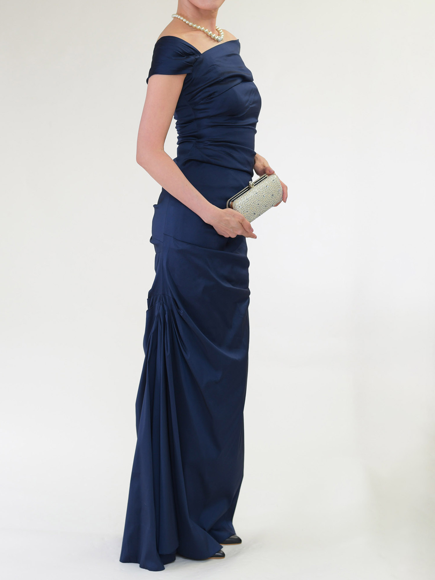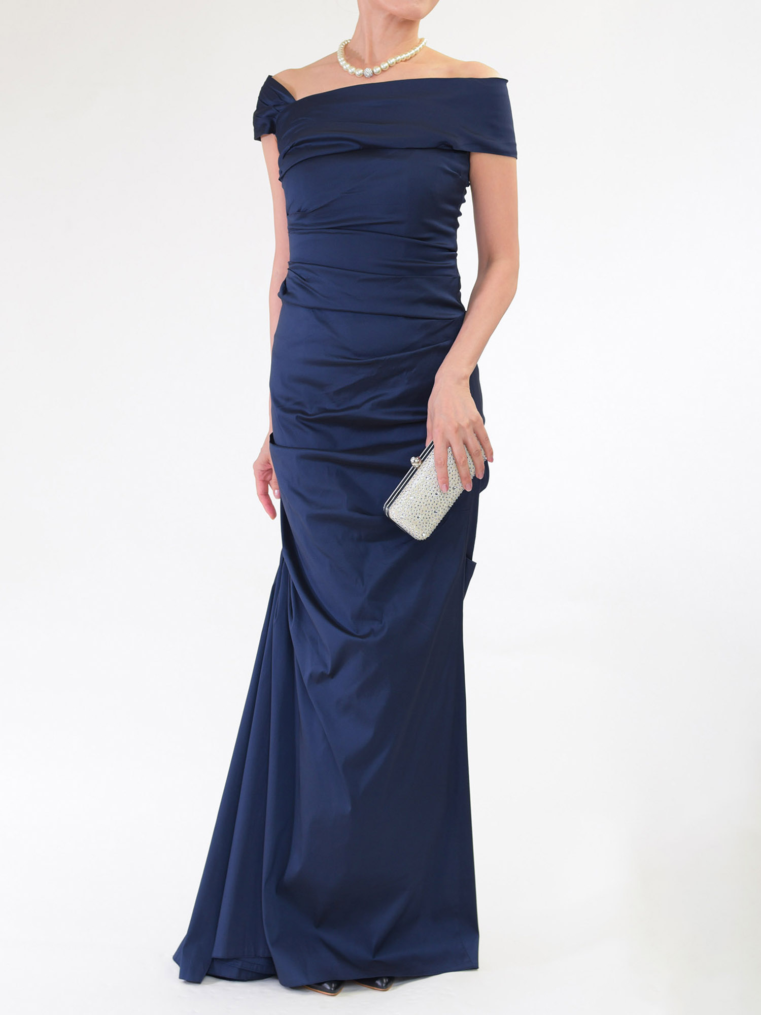 ストレッチの効いた光沢のある生地で作られた、デザイン性の高いドレスです。ビジューなどの飾りは一切ついていませんが、デザインが凝っていてアシンメトリーなスタイル。スカート部分は左右でデザインが違っていて、右側にタックが寄せられていてボリュームがあるスタイル。左側はタックが少なくスレンダーなラインになっています。 襟元のあきもアシンメトリーで、鎖骨がきれいに見える絶妙に計算されたデザイン。胸元があきすぎることもありません。 胸元があきすぎることもありません。 ストレッチが効いた生地は軽く、着ていてとても楽なのが特徴です。細みのシルエットに見えますが、ウエスト部分には程よくひだが入っていて、予想以上に体型をカバーしてくれます。シンプルにセンスよく着こなしたいお母様にお勧めのドレスです。