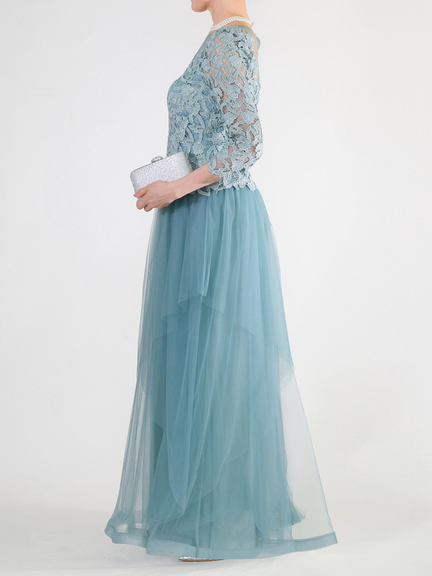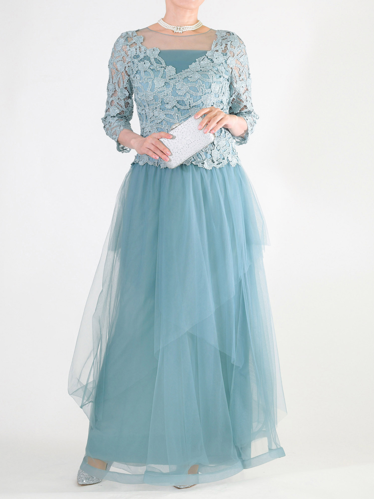 レースをふんだんに使った豪華なチュールドレス。トップは手の込んだレース生地。広くあいた胸元には、メッシュ素材があしらわれ、鎖骨あたりまで覆われています。さらに襟元に沿ってレースが華やかに踊り、デコルテを美しく飾ります。袖もレースでできていて、程よい透け感が上品。 スカート部分は最近はやりのチュール素材。カッティングしたメッシュ素材を重ねることでふんわりとしたボリュームが出ています。コンパクトにまとめられた上半身とのバランスも絶妙で、脚長効果も十分。ウエスト部分にふんだんに入ったギャザーは、お腹周りをしっかりカバー。チュール素材なので軽やかさもあり、動くたびに揺れるチュールが華やかな印象を与えます。 結婚式だけでなく、本格的なパーティーや晩餐会などでも着ていただけるドレスです。
