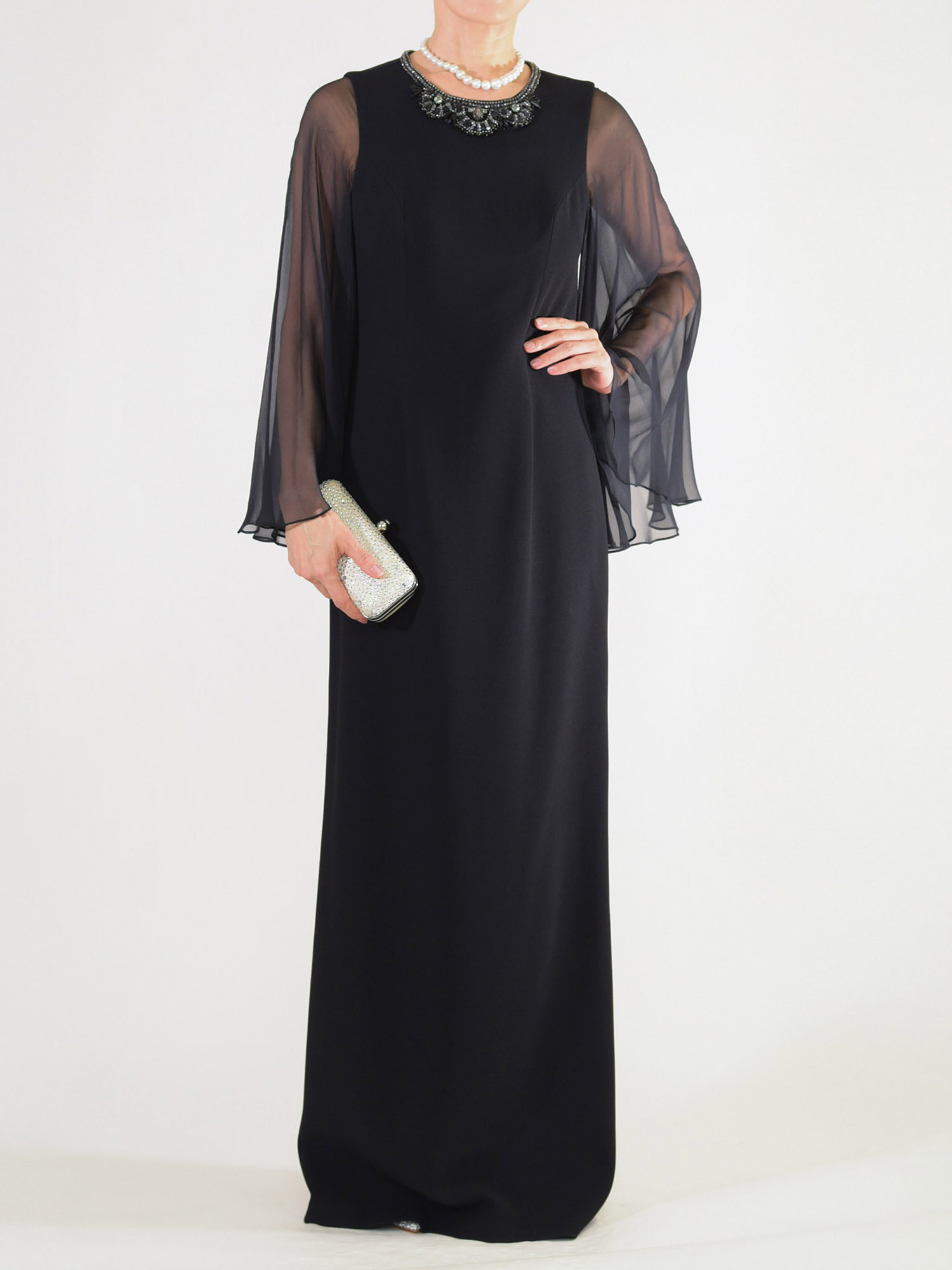 黒の上質なジョーゼットのドレスです。ストンとしたIラインのシルエット。生地に厚みがあるため、程よい重さで裾までの落ち感がとてもきれい。黒でもカチッとしすぎないデザインで、シルクシフォンの袖が動くたびに揺れてソフトな印象を与えます。 襟元には上品なビジューがほどこされており、顔まわりを華やかに。首元から裾まで1枚の布で仕立ててあり、ウエスト部分に切り替えがありません。それでもパターンが立体的に作られているためボディが入るとゆるく体にフィットして、気になるウエストやヒップをカバーしつつも女性らしいフォルムが浮かび上がります。 後ろは裾にスリットが入っていますが、スリットの分かれ目が重なっているため脚の露出は控えめになります。