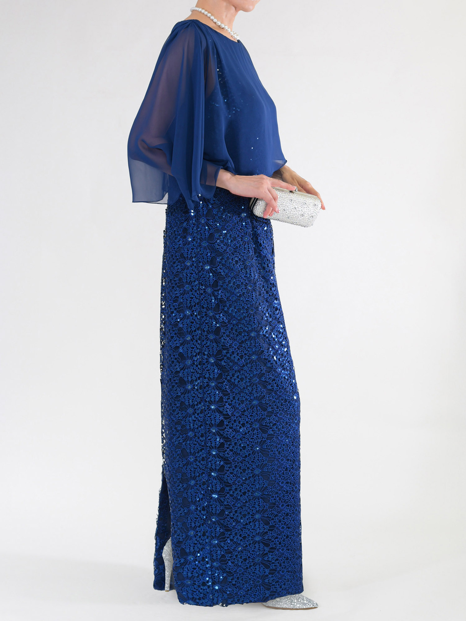 全体にスパンコールが織り込まれた華やかでゴージャスなレース生地を贅沢に使用したフォーマルドレスです。 切り替えの無いストンとしたストレートのシルエットでウエスト周りを締め付けず、とても動きやすく着心地もラクです。 しっかりとした重厚感のあるレースは身体のラインを拾い過ぎず、且つ、生地の重さで身体に沿って落ちるため余分なもたつきも無く、すっきりと着やせする秀逸なカバー力が頼れる1着です。 ショート丈のシフォン生地がケープのようにふんわりと上半身をカバー。斜めのラインが全身をスッキリと縦長に見せ、お腹周りやバスト、二の腕も目立たないデザインです。 シフォンから身頃のスパンコールが動作に合わせてキラキラと透ける様子もさりげなく上品な華やかさを演出します。