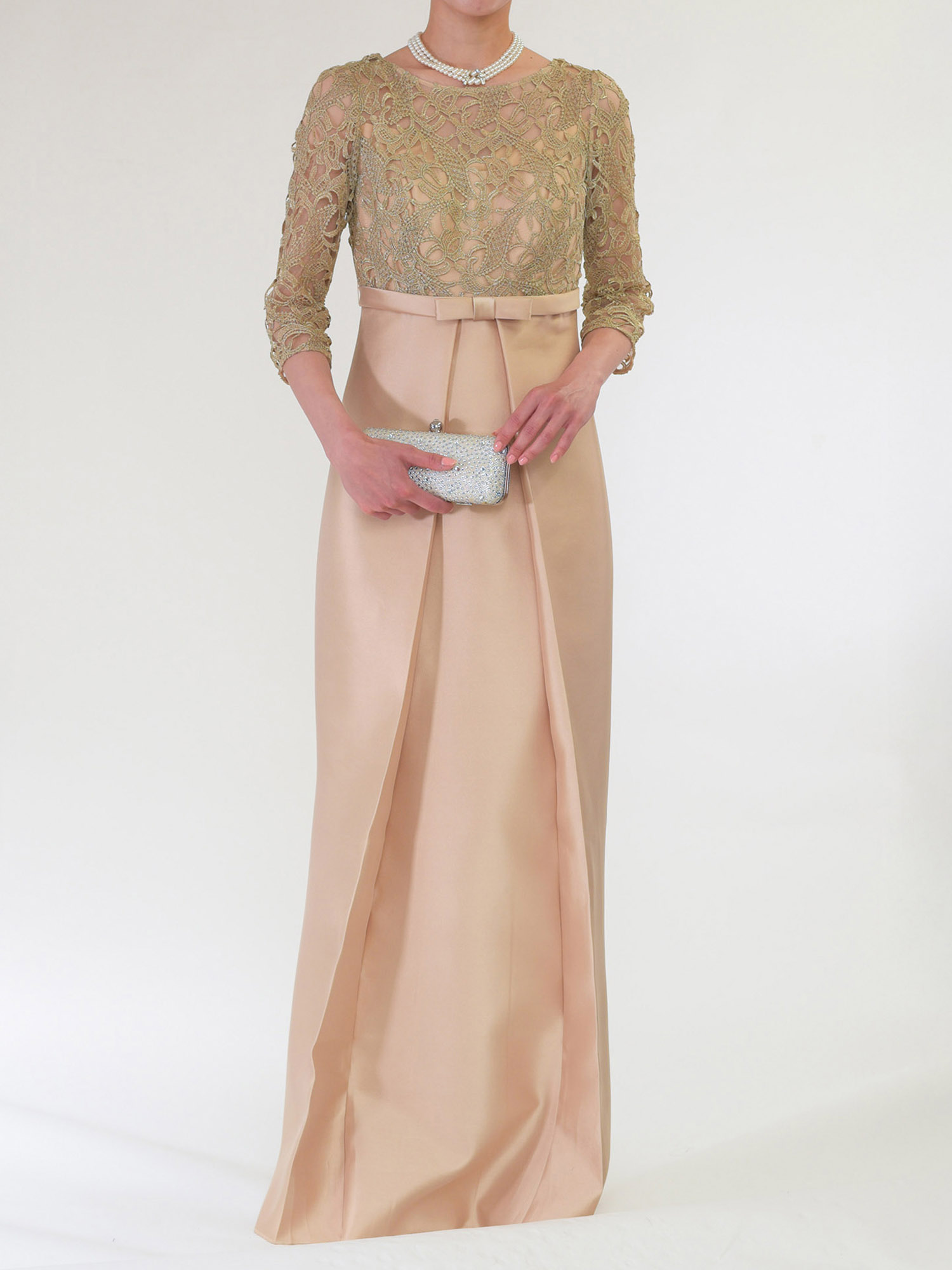 華やかなシャンパンゴールドのカラーと、膝を絞りすぎず緩やかなカーブを描くマーメードラインがとてもエレガントなフォーマルドレスです。 シャンパンやシルバーなどの華やかで明るい色のフォーマルドレスを着たいけれど、写真を撮った時に白っぽく写ってしまうのは避けたい、という方にもおすすめです。 ゴールドのラメ糸が織り込まれたレース生地はビジューなどの装飾もなく、肌馴染みの良い色合いですので、派手になり過ぎることはなく、落ち着いたフォーマルで上品な印象です。 ハイウエストの切り替えと裾まで入ったタックが作る縦のラインがスラリと脚長に見せるので、華奢で小柄な体型で、ドレスを着るとウエストの位置が落ちて重心が下がってしまいがちな方もバランス良く着用していただきやすいデザインです。