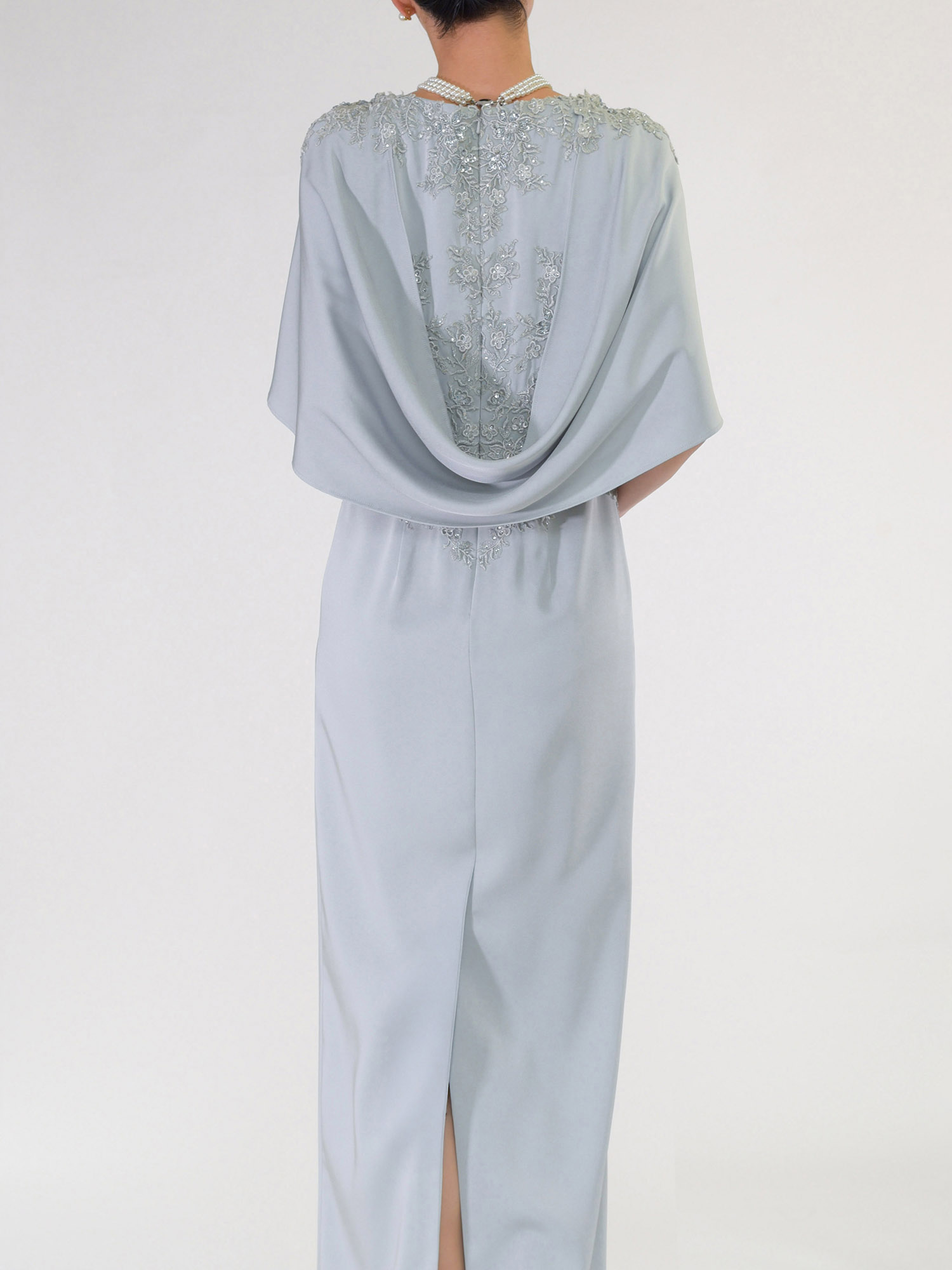 落ち着いた光沢が美しいシルバーカラーが、お顔まわりを明るく引き立て、式場の照明にも映える華やかさを演出。身体に沿いすぎないストレートラインが自然な縦のラインを作り、すっきりとした美しいシルエットを実現します。ウエストのベルトデザインが全体を引き締め、スタイルアップ効果も抜群。肩からふわりと重なるレースケープが二の腕や上半身をエレガントにカバーし、露出を控えつつも華やかな印象に。パールアクセサリーやクラッチバッグとの相性も良く、写真映えと安心感を両立する、大人の女性にふさわしい一着です。