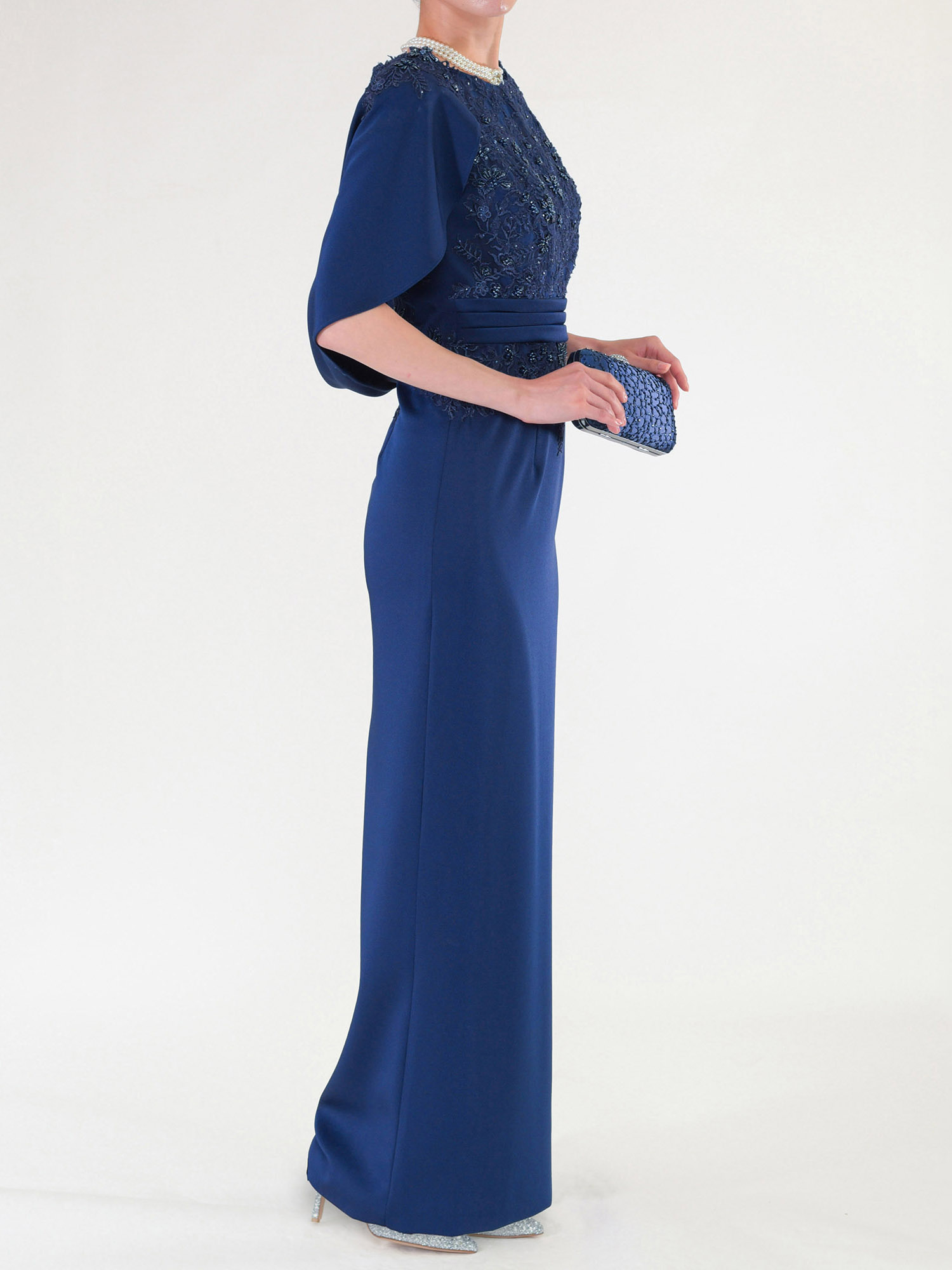 深みのあるネイビーカラーにビジューの煌めきが映える、母親の晴れ姿にふさわしい一着。上品な光沢感と縦のラインを美しく引き出すストレートシルエットが、スタイルをすっきり見せながら優雅な雰囲気を演出します。胸元やウエスト部分に施されたビジュー装飾が、光の角度によって上品にきらめき、写真映えも抜群。肩まわりを包み込むレースケープ風のデザインは、二の腕をさりげなくカバーしつつ、動きやすさと安心感を両立します。華美すぎず控えめすぎない絶妙なバランスが、結婚式という特別な日にぴったり。格式と華やかさを兼ね備えた、大人の女性のためのフォーマルドレスです。