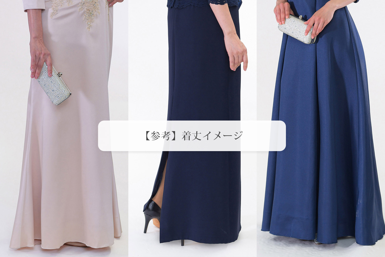 ロングドレスの基本の着丈は、靴が少し見える程度です。ドレスの裾デザインによって長め、短めがお勧めになる場合もございます。