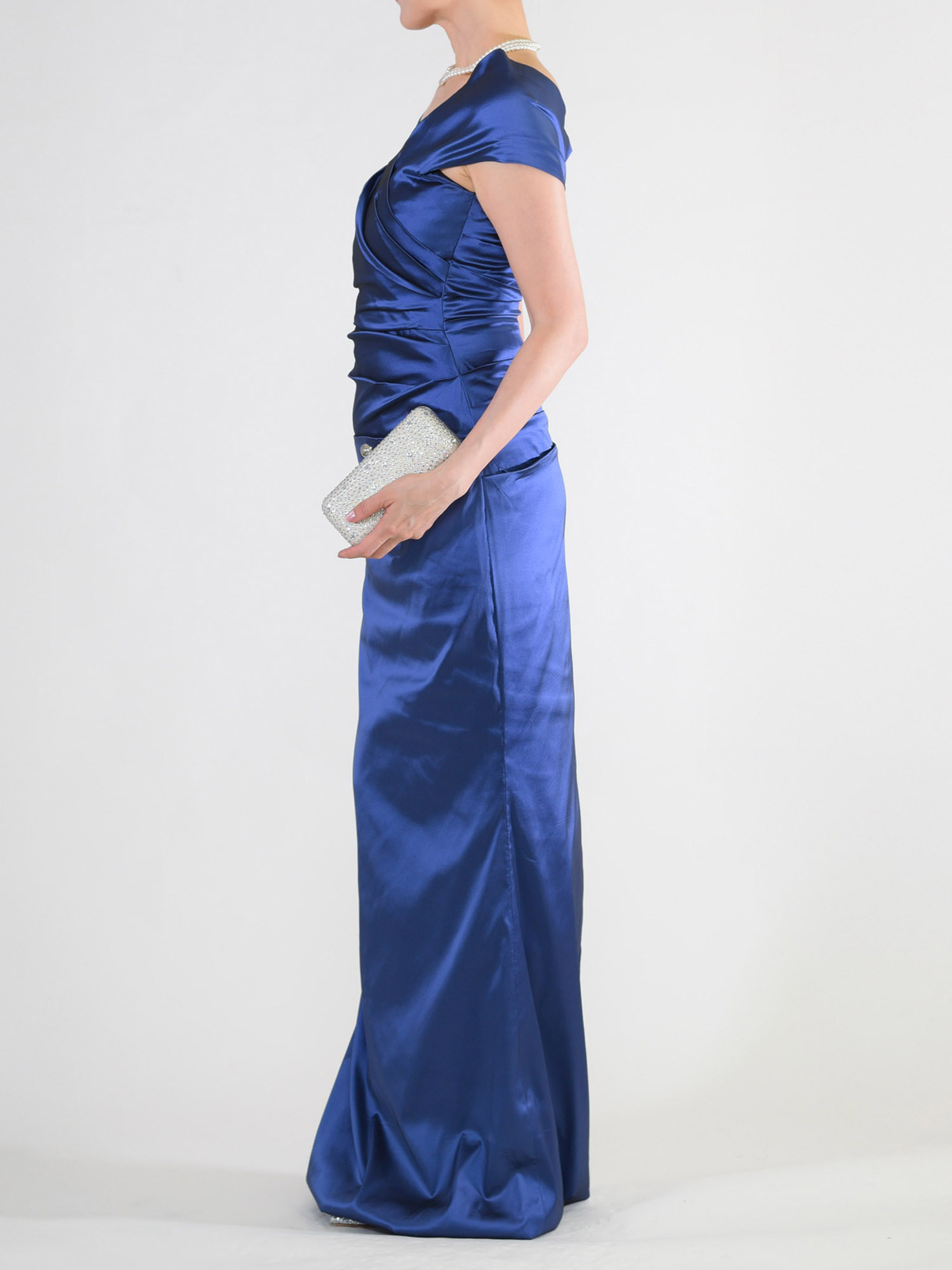 L-84ブルーグレーの色違いドレス、ロイヤルブルーです。ビジューやレースを使っていないとてもシンプルなデザインですが、光沢のある上質な生地で作られてあり、着るとシックな大人の華やかさがあります。生地は軽くて伸縮性がありますから、締め付け感がなく着ていてとても楽。 色はロイヤルブルーというイギリス王室の青色。鮮やかな色味ですが、決して派手ではなく、ネイビーよりは涼やかな明るさがあります。 写真ですと細身の形に見えますが、胸元からウエストに斜めにタックが入っていて、それがウエスト周りをうまくカバーしてくれます。 襟は左右合わせのV字ネック。このV字の襟にネックレスがきれいにおさまり、ネックラインをスッキリ見せます。 肩は流行のオフショルタイプで、少し肩を落として着ていただくのが今風です。肩山から二の腕を覆うデザインなので、袖なしですが腕が思う以上にほっそり見えると思います。 歩きやすいように後ろにはスリットが入っています。