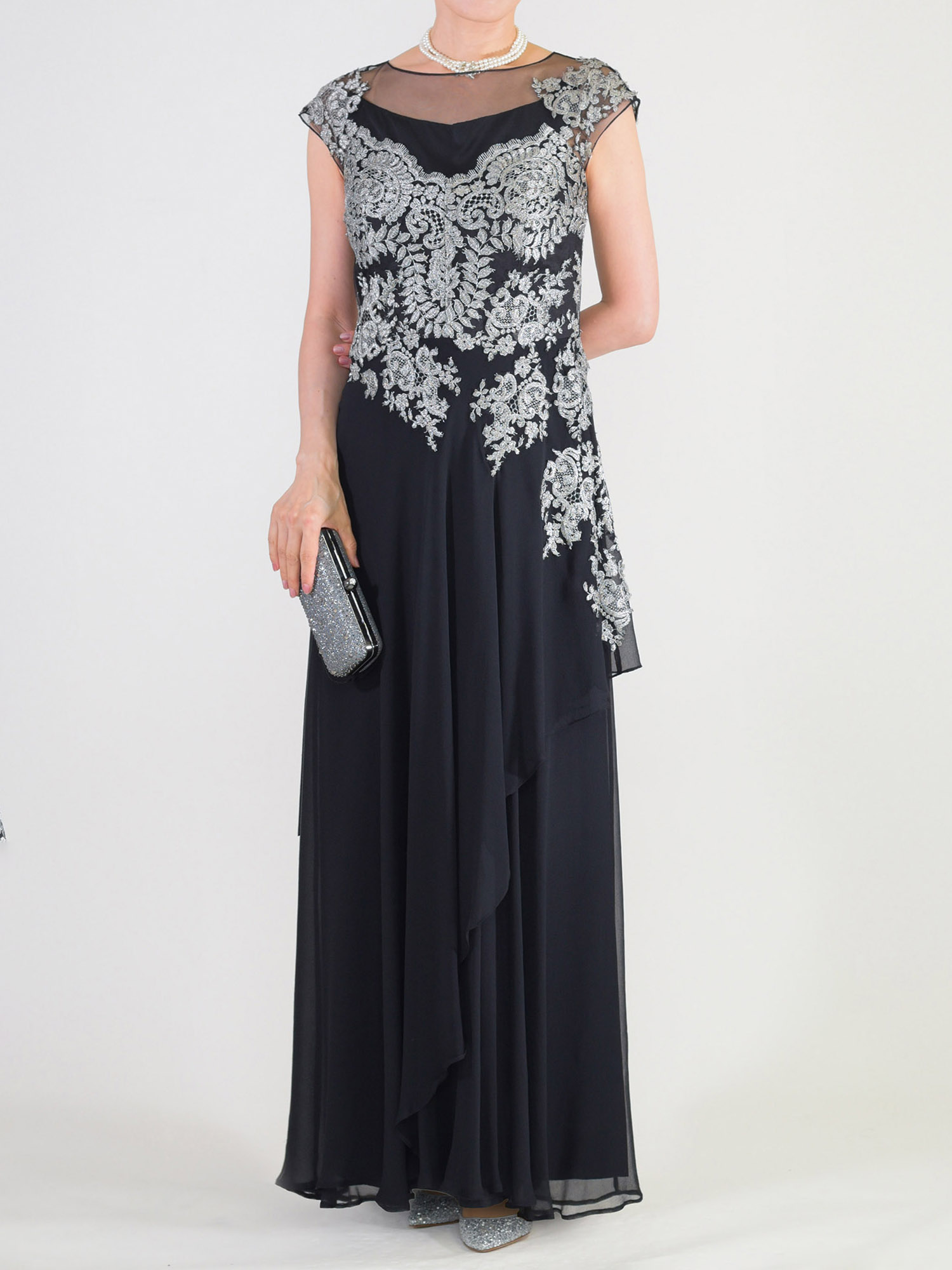 ブラックのシルクシフォンにシルバーの刺繍がほどこされた、シックでモダンなドレスです。シルバーの刺繍部分の模様はとても細かく繊細で、それがシルクシフォンの生地に手縫いで付けられていて、とても手の込んだ仕立てとなっています。襟元は細かいメッシュのレース地で、襟は丸首ではなく横に長いボートネック。このラインが首筋からデコルテを上品に見せてくれます。袖はフレンチスリーブで肩山と二の腕の上の部分がちょうど隠れるくらい。胸元から肩にかけてシルバーの刺繍がエレガンントに飾り、顔周りに明るさをプラス。そのため黒のドレスですが、暗い印象にならず、おめでたい場にもふさわしいデザインです。胸元からウエスト、身頃の左部分へと流れるアシンメトリーの刺繍は、スタイルをほっそりと見せてくれる効果があります。 スカート部分はシルクシフォンが二重になっていて、動くたびにそのシルクシフォンが軽やかに揺れるところはとてもエレガント。シルク素材なので大変軽く、着ていて負担がかからず楽に着ていただけます。
