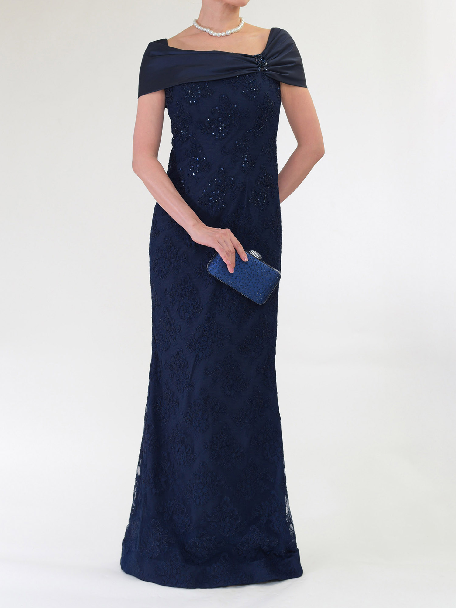 総レースのマーメイドラインのドレスです。レースの生地は高級なものを使用しており、レース地の上に繊細な刺繍が施されています。さらに上半身には華やかさを加えるためスパンコールが散りばめられていてゴージャスな仕上がりに。ウエストから下の部分にはスパンコールがついていないので、派手すぎることもなく上品で洗練されたデザインです。 全体的にはマーメイドのシルエット。上から下まで1枚の布で仕立ててあり、ウエスト部分に切り替えがありません。立体的なパターンで作られていますから、ボディが入るときれいな流線型のマーメイドラインが完成します。 首周りは張りのあるタフタ素材の襟がついていて、これが胸元に程よいボリュームを与えています。そのため顔周りも明るくふわっとした印象に。肩山から上腕部分までタフタのカラーがすっぽりと包み込むため、気になる二の腕もカバーされて袖がなくても安心して着ていただけます。