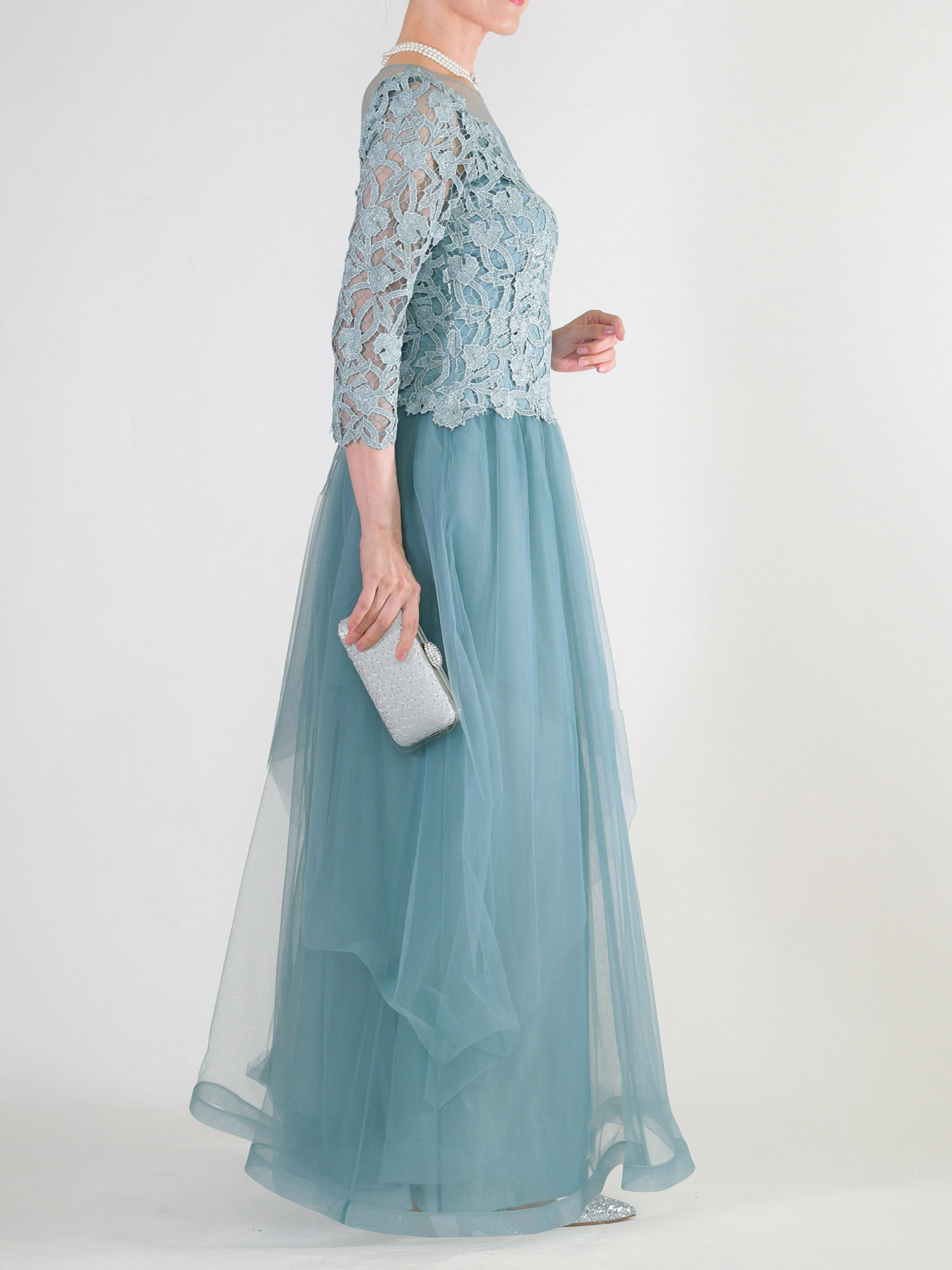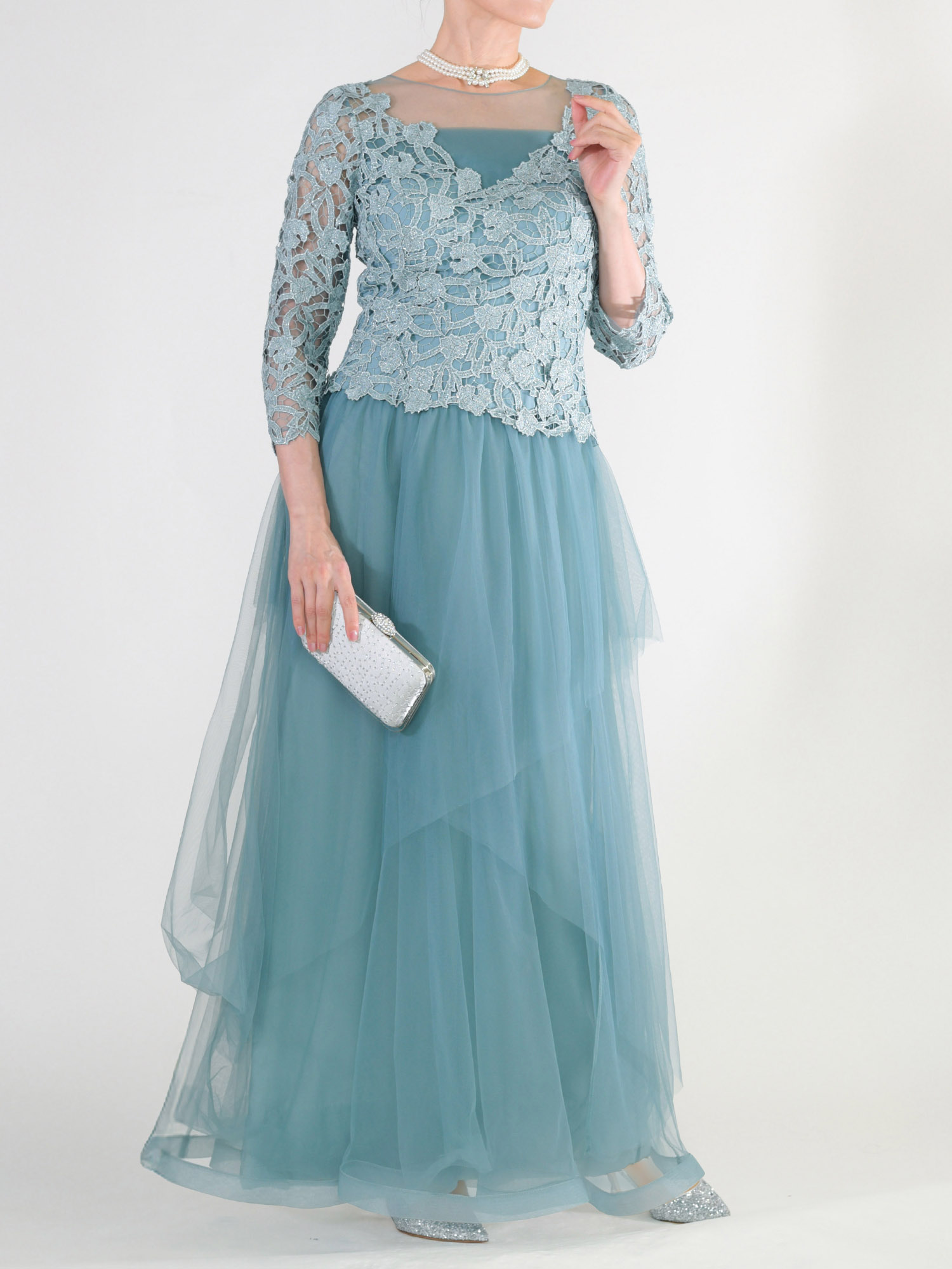 レースをふんだんに使った豪華なチュールドレス。トップは手の込んだレース生地。広くあいた胸元には、メッシュ素材があしらわれ、鎖骨あたりまで覆われています。さらに襟元に沿ってレースが華やかに踊り、デコルテを美しく飾ります。袖もレースでできていて、程よい透け感が上品。 スカート部分は最近はやりのチュール素材。カッティングしたメッシュ素材を重ねることでふんわりとしたボリュームが出ています。コンパクトにまとめられた上半身とのバランスも絶妙で、脚長効果も十分。ウエスト部分にふんだんに入ったギャザーは、お腹周りをしっかりカバー。チュール素材なので軽やかさもあり、動くたびに揺れるチュールが華やかな印象を与えます。 結婚式だけでなく、本格的なパーティーや晩餐会などでも着ていただけるドレスです。