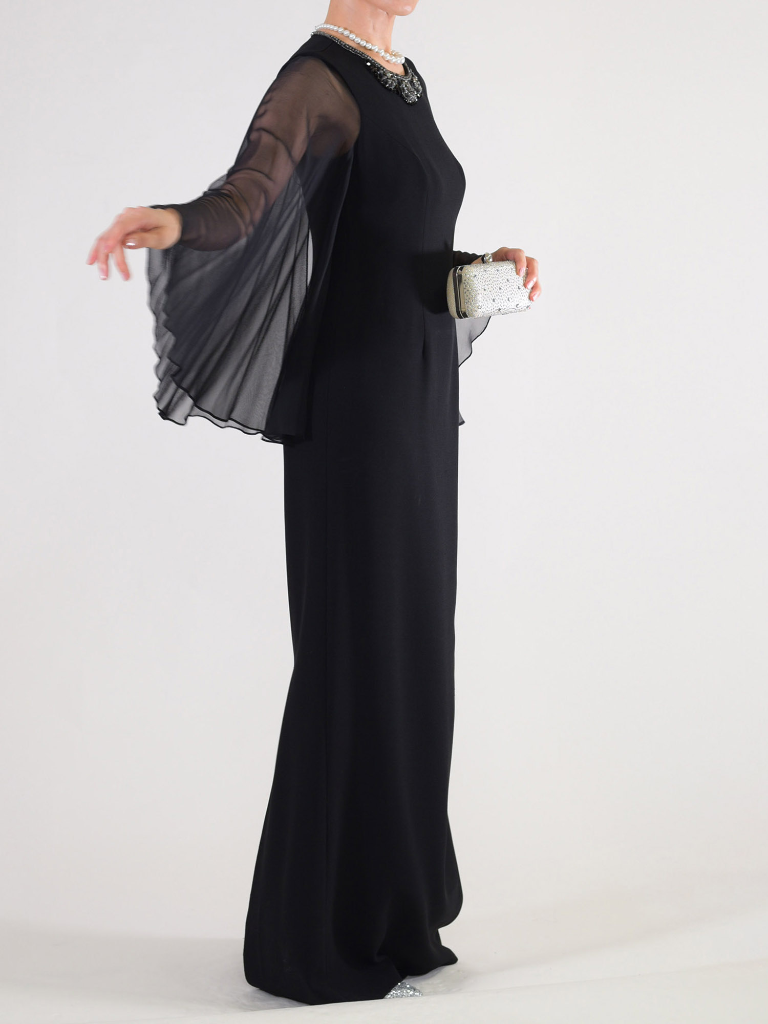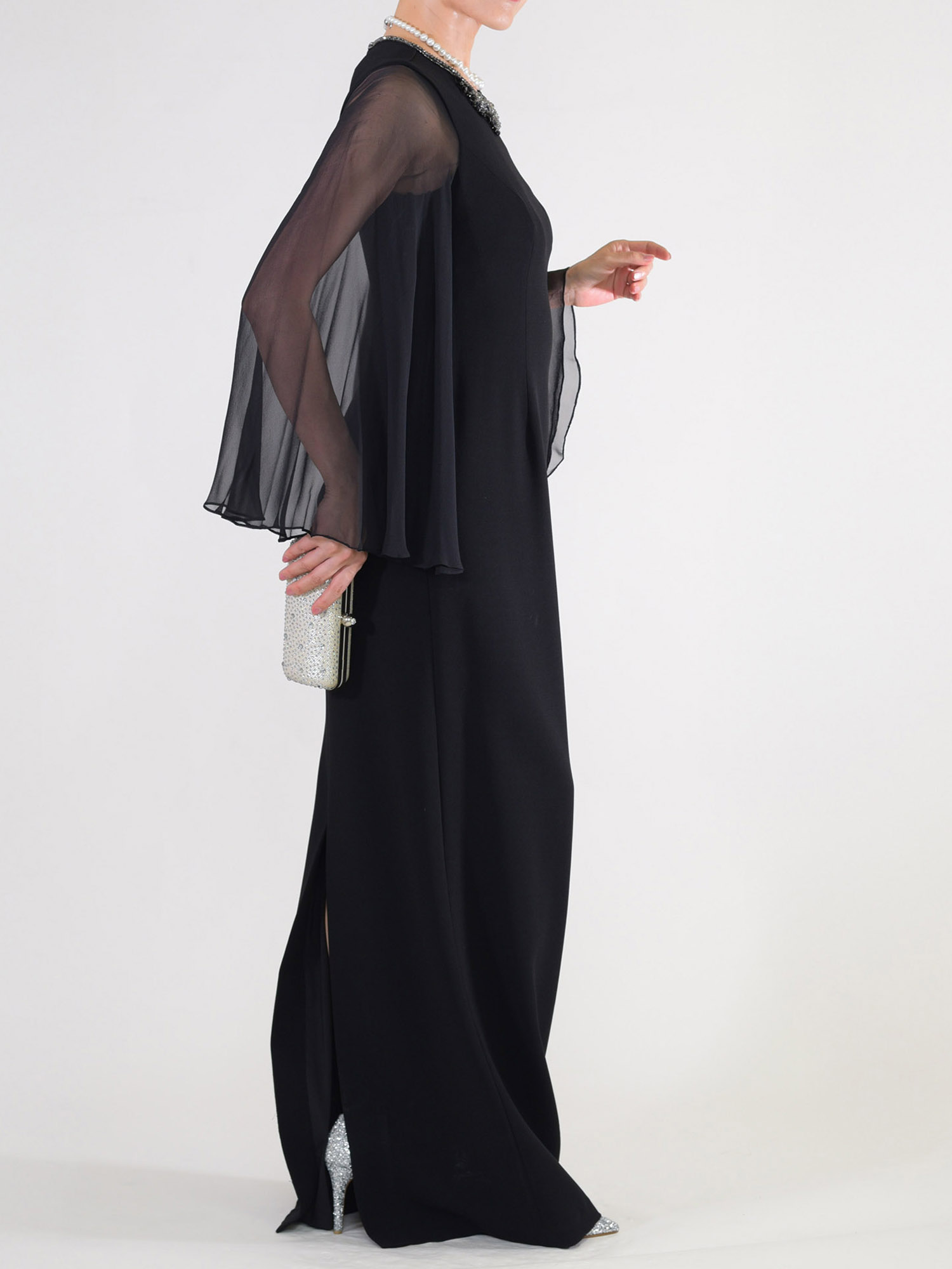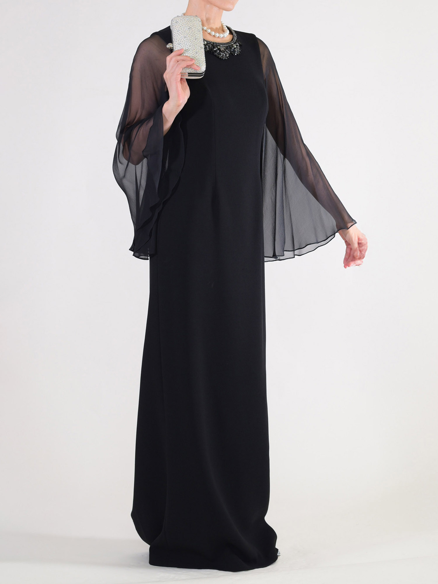 黒の上質なジョーゼットのドレスです。ストンとしたIラインのシルエット。生地に厚みがあるため、程よい重さで裾までの落ち感がとてもきれい。黒でもカチッとしすぎないデザインで、シルクシフォンの袖が動くたびに揺れてソフトな印象を与えます。 襟元には上品なビジューがほどこされており、顔まわりを華やかに。首元から裾まで1枚の布で仕立ててあり、ウエスト部分に切り替えがありません。それでもパターンが立体的に作られているためボディが入るとゆるく体にフィットして、気になるウエストやヒップをカバーしつつも女性らしいフォルムが浮かび上がります。 後ろは裾にスリットが入っていますが、スリットの分かれ目が重なっているため脚の露出は控えめになります。