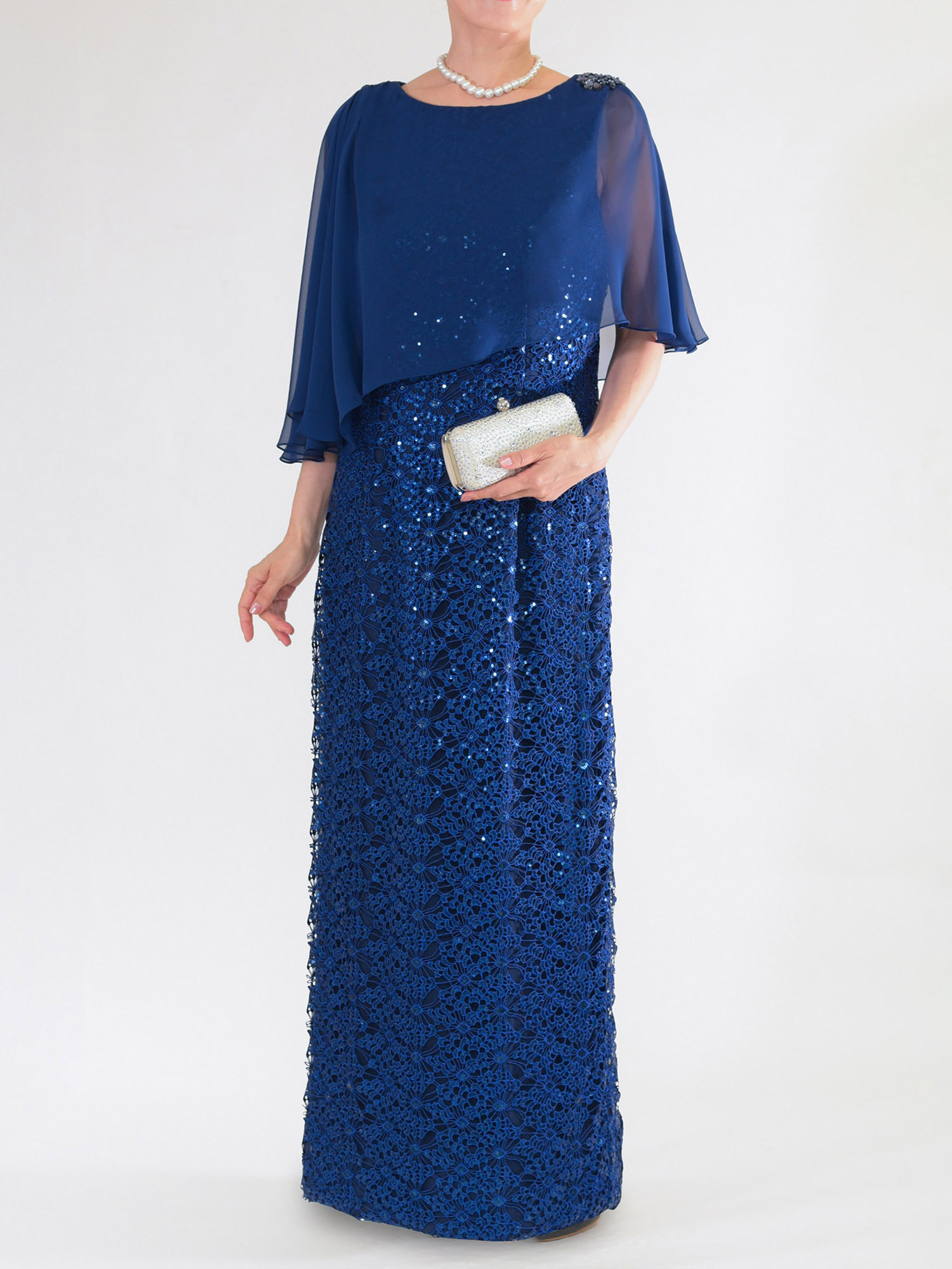 全体にスパンコールが織り込まれた華やかでゴージャスなレース生地を贅沢に使用したフォーマルドレスです。 切り替えの無いストンとしたストレートのシルエットでウエスト周りを締め付けず、とても動きやすく着心地もラクです。 しっかりとした重厚感のあるレースは身体のラインを拾い過ぎず、且つ、生地の重さで身体に沿って落ちるため余分なもたつきも無く、すっきりと着やせする秀逸なカバー力が頼れる1着です。 ショート丈のシフォン生地がケープのようにふんわりと上半身をカバー。斜めのラインが全身をスッキリと縦長に見せ、お腹周りやバスト、二の腕も目立たないデザインです。 シフォンから身頃のスパンコールが動作に合わせてキラキラと透ける様子もさりげなく上品な華やかさを演出します。