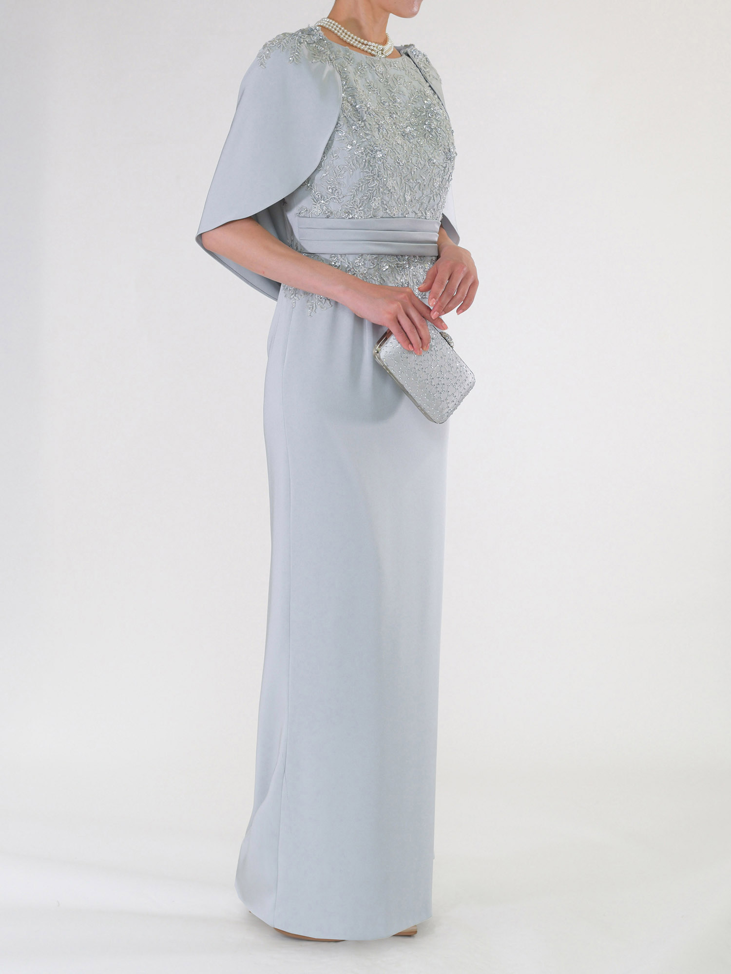 落ち着いた光沢が美しいシルバーカラーが、お顔まわりを明るく引き立て、式場の照明にも映える華やかさを演出。身体に沿いすぎないストレートラインが自然な縦のラインを作り、すっきりとした美しいシルエットを実現します。ウエストのベルトデザインが全体を引き締め、スタイルアップ効果も抜群。肩からふわりと重なるレースケープが二の腕や上半身をエレガントにカバーし、露出を控えつつも華やかな印象に。パールアクセサリーやクラッチバッグとの相性も良く、写真映えと安心感を両立する、大人の女性にふさわしい一着です。