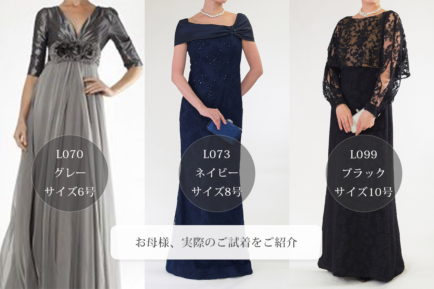 L070グレーはとても素敵でしたが、実際に着てみるとL073ネイビーの方が上品なイメージで家族からも好評価。派手過ぎない控えめなビジューがダークネイビーに映えて、胸元のデザインから肩・腕のデザインも気に入りました。また、さりげないマーメイドライン、凛とした日本人らしさが表現されているような雰囲気、サイズも8号がピッタリみたいで、自然な流れの中で選ぶ事が出来ました。